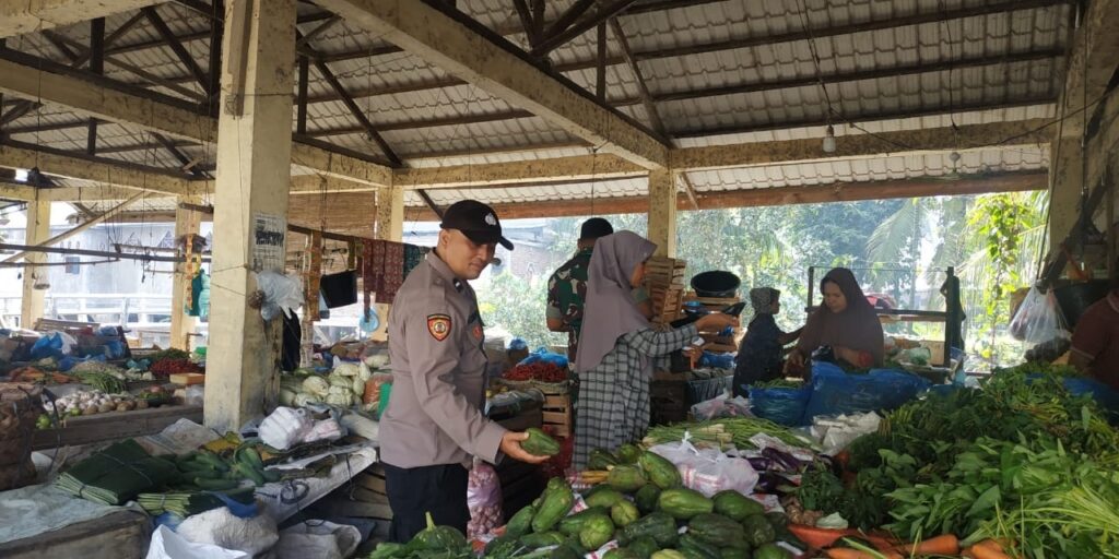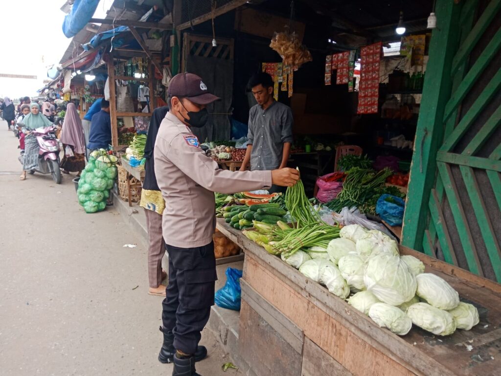 LHOKSEUMAWE - Personel Polsek Nisam mengecek stok sayuran dan sembako lainnya di pasar tradisional di Kecamatan Nisam, Aceh...