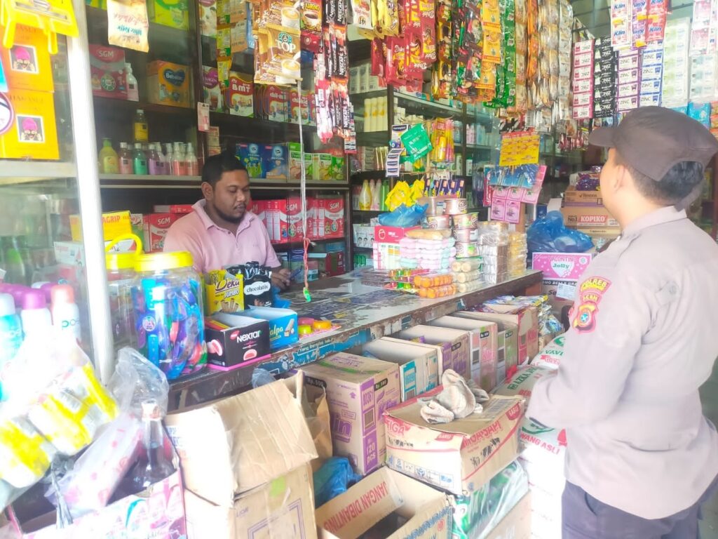 LHOKSEUMAWE - Personel Polsek Sawang mengecek stabilitas stok sembako di sejumlah kedai kelontong di Kecamatan Sawang, Aceh Utara, wilayah...