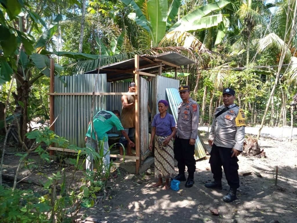 LHOKSEUMAWE - Kapolsek Simpang Keuramat, Iptu Gunawan Adi membantu rehab kamar mandi di rumah warga kurang mampu di Simpang...