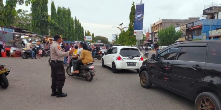 LHOKSEUMAWE – Aktivitas masyarakat padat saat ngabuburit atau jelang berbuka puasa, personel Polsek Banda Sakti mengatur arus lalu lintas di sejumlah persimpangan di Kota Lhokseumawe, Sabtu (25/3/2023) sore.