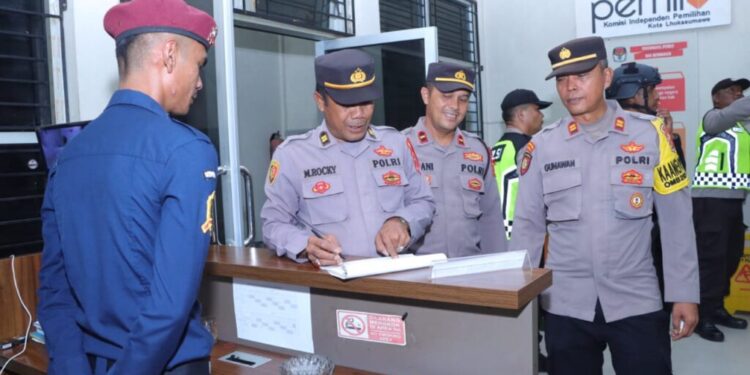 LHOKSEUMAWE – Personel gabungan Polres Lhokseumawe menemui petugas keamanan di kantor Komisi Independen Pemilihan (KIP) Kota Lhokseumawe saat melaksanakan Operasi Mantap Brata Seulawah 2023-2024, Kamis (21/12/2023) malam.