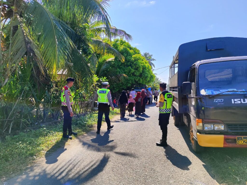 LHOKSEUMAWE – Personel gabungan Polres Lhokseumawe melakukan pengamanan kampanye calon legislatif (caleg) Partai Demokrat di lapangan bola kaki Desa Meunasah Drang, Muara Batu, Aceh Utara, wilayah hukum Polres Lhokseumawe, Rabu (31/1/2024) sore.
