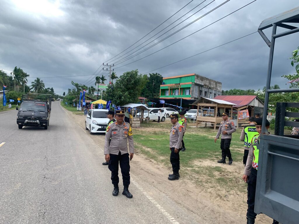LHOKSEUMAWE – Personel Polres Lhokseumawe melakukan pengamanan kampanye tatap muka calon legislatif (caleg) DPR RI Dapil Aceh 2 dari Partai Amanat Nasional (PAN) di Desa Cot Mee, Nisam, Aceh Utara, wilayah hukum Polres Lhokseumawe, Kamis (28/12/2023).