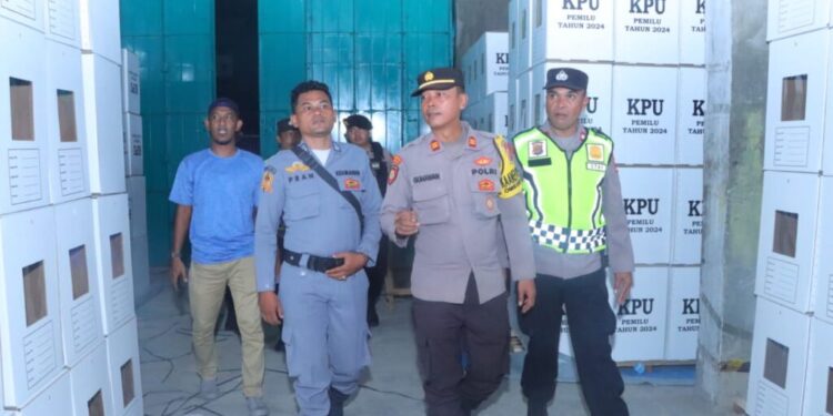 LHOKSEUMAWE – Personel Polres Lhokseumawe mendatangi gudang logistik pemilu di wilayah hukum Polres Lhokseumawe pada saat melaksanakan Operasi Mantap Brata Seulawah 2023-2024, Minggu (18/11/2023) malam.