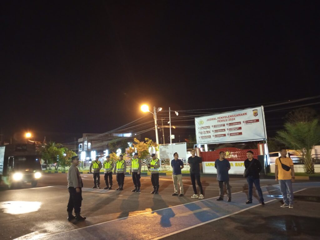 LHOKSEUMAWE – Personel Polres Lhokseumawe melakukan pengamanan pada kegiatan kampanye tatap muka Caleg DPRK Lhokseumawe dari Partai Demokrasi Indonesia Perjuangan (PDI-P) di Desa Blang Weu Baroh, Kecamatan Blang Mangat, Kota Lhokseumawe, Rabu (17/1/2024) malam.