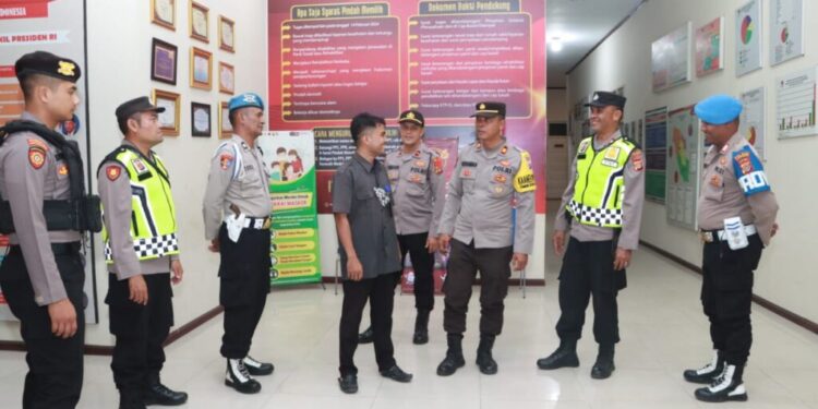LHOKSEUMAWE – Personel gabungan Polres Lhokseumawe memberikan himbauan Kamtibmas kepada petugas keamanan di kantor KIP Kota Lhokseumawe, Sabtu (25/11/2023).