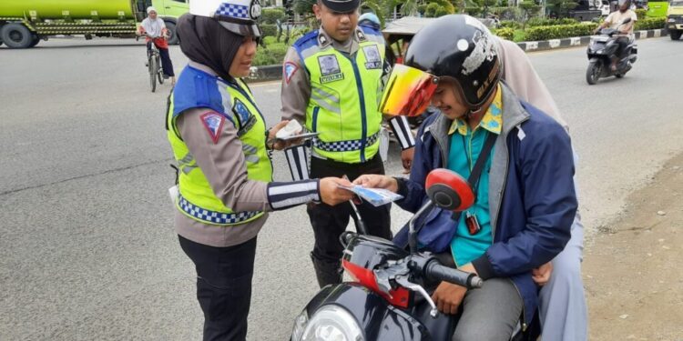 LHOKSEUMAWE – Polantas Lhokseumawe mensosialisasikan tertib berlalu lintas dan membagikan brosur kepada pengguna jalan raya di depan bundaran Pos Lantas, Cunda, Muara Dua, Kota Lhokseumawe, Senin (13/2/2023).