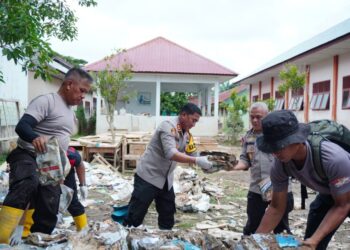 Polres Lhokseumawe dan Brimob Bersihkan MIN 1 dan SMPN 1 Muara Batu