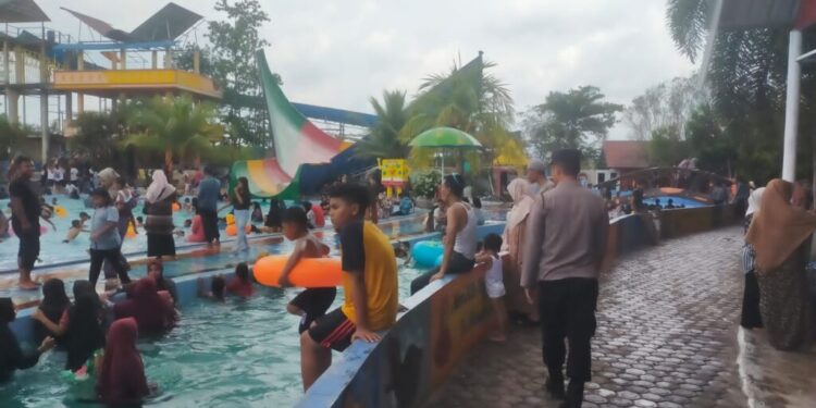 LHOKSEUMAWE – Operasi Ketupat Seulawah 2023, personel Polsek Blang Mangat melaksanakan patroli dan memberi himbauan kepada pengunjung obyek wisata Water Boom Mangat Ceria, Kecamatan Blang Mangat, Kota Lhokseumawe, Sabtu (29/4/2023).