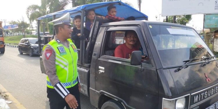 LHOKSEUMAWE – Polantas Lhokseumawe menegur supir mobil bak terbuka (pickup) yang mengangkut penumpang di jalan Medan – Banda Aceh, wilayah hukum Polres Lhokseumawe, Sabtu (29/4/2023).