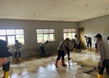 Lhokseumawe — Personel Polres Lhokseumawe bersama BKO Brimob dan Polsek Dewantara melaksanakan kegiatan pembersihan lumpur pascabanjir di SMP Negeri 2 ...