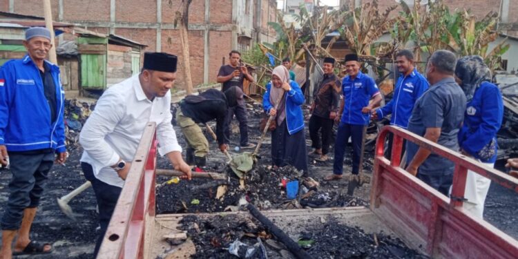 LHOKSEUMAWE – Pengurus Partai Amanat Nasional (PAN) membantu membersihkan puing sisa kebakaran dan menyerahkan bantuan masa panik kepada warga yang rumahnya terbakar di Gampong Jawa Baru, Banda Sakti, Kota Lhokseumawe, Selasa (16/5/2023).