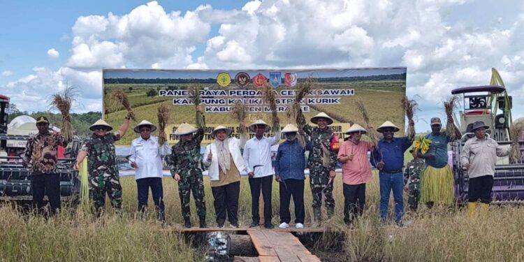 MERAUKE-Masyarakat lokal kampung Kaliki Distrik Kurik Kabupaten Merauke, Papua Selatan melakukan panen raya padi perdana diareal lahan persawahan seluas 43 hektar. Panen raya tersebut dihadiri langsung Gubernur dan Wakil Gubernur Papua Selatan Apolo Safanpo – Paskalis Imadawa dan Bupati – Wakil Bupati Merauke Yoseph Bladip Gebze – Fauzan Nihayah, Anggota Komisi IV DPR RI H. Sulaiman L. Hamzah, TNI, Polri, Forkopimda dan masyarakat lokal kampung Kaliki.