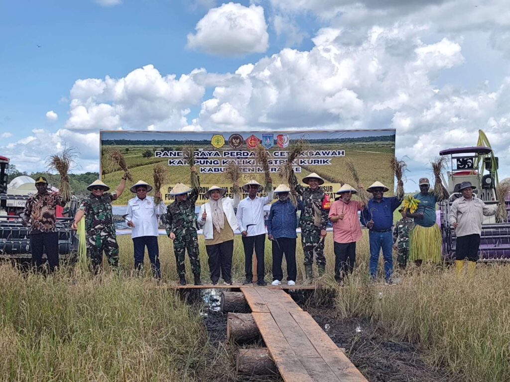 MERAUKE-Masyarakat lokal kampung Kaliki Distrik Kurik Kabupaten Merauke, Papua Selatan melakukan panen raya padi perdana diareal lahan persawahan seluas 43 hektar. Panen raya tersebut dihadiri langsung Gubernur dan Wakil Gubernur Papua Selatan Apolo Safanpo – Paskalis Imadawa dan Bupati – Wakil Bupati Merauke Yoseph Bladip Gebze – Fauzan Nihayah, Anggota Komisi IV DPR RI H. Sulaiman L. Hamzah, TNI, Polri, Forkopimda dan masyarakat lokal kampung Kaliki.