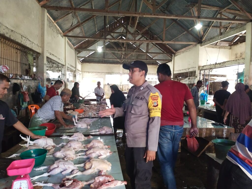 LHOKSEUMAWE – Personel Polsek Blang Mangat turun ke pasar tradisional di wilayah Kecamatan Blang Mangat, Kota Lhokseumawe untuk memantau stok sembilan bahan pokok (sembako), Senin (20/2/2023).