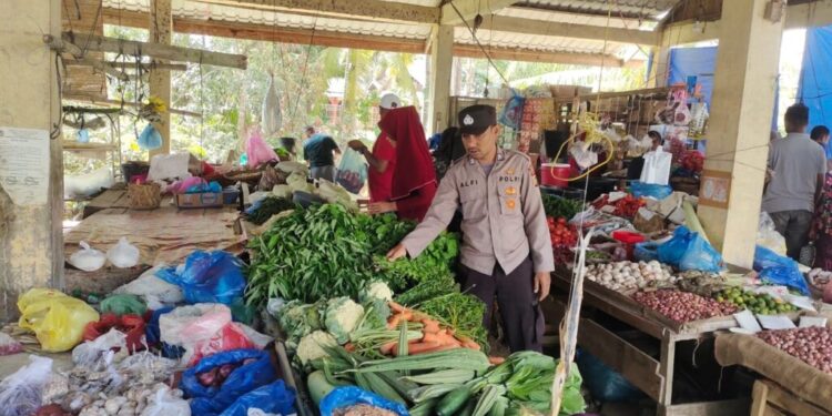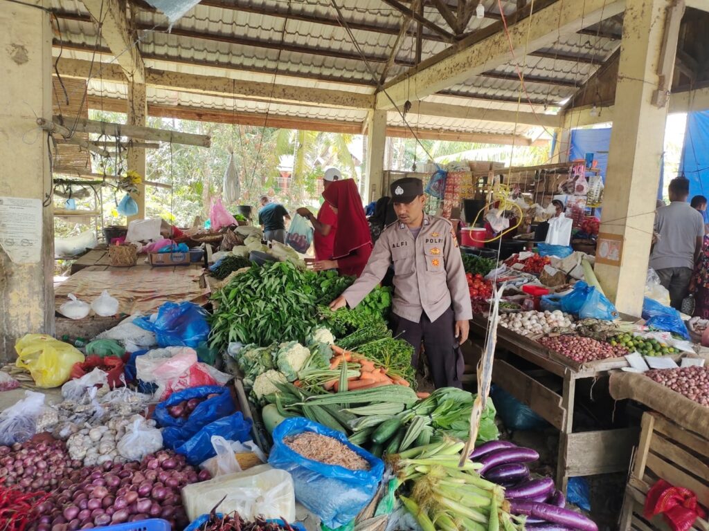 LHOKSEUMAWE – Pantau stok sembako, personel Polsek Nisam turun ke pasar tradisional di Kecamatan Nisam, Aceh Utara, wilayah hukum Polres Lhokseumawe, Sabtu (6/5/2023).