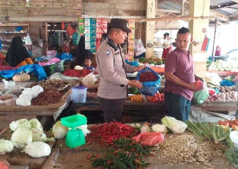 LHOKSEUMAWE – Pastikan stok sembako stabil, personel Polsek Nisam rutin sambang pedagang di pasar tradisional dan toko kelontong selama bulan suci Ramadhan di pasar Keude Amplah, Kecamatan Nisam, Aceh Utara, wilayah hukum Polres Lhokseumawe, Sabtu (1/4/2023).