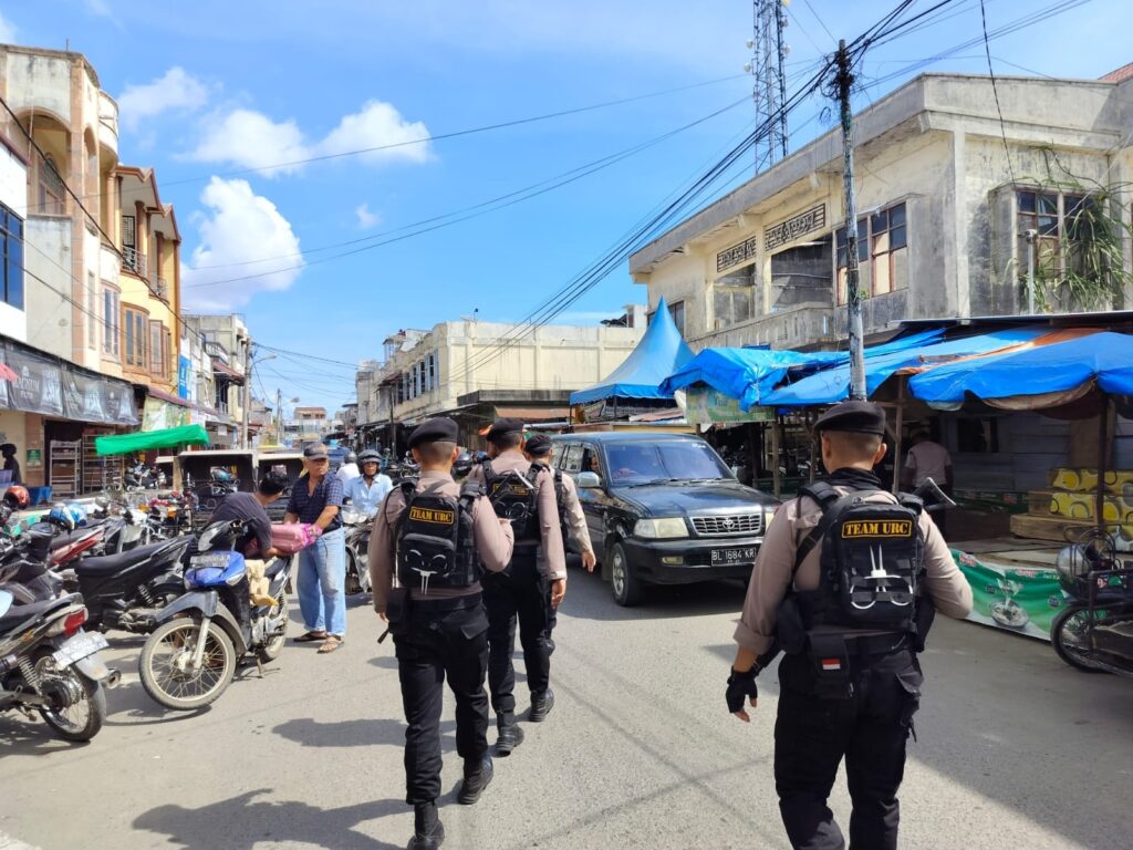 LHOKSEUMAWE – Patroli cegah aksi premanisme, Tim Unit Reaksi Cepat (URC) Sat Samapta Polres Lhokseumawe memantau aktivitas masyarakat di pasar Cunda, Kecamatan Muara Dua, Kota Lhokseumawe, Sabtu (6/5/2023) pagi.