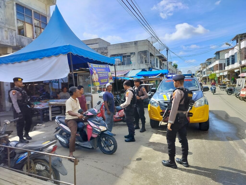 LHOKSEUMAWE – Patroli cegah aksi premanisme, Tim Unit Reaksi Cepat (URC) Sat Samapta Polres Lhokseumawe menyambagi pedagang di pasar Cunda, Kecamatan Muara Dua, Kota Lhokseumawe, Sabtu (27/5/2023) pagi.