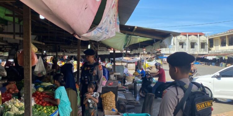 LHOKSEUMAWE – Patroli cegah aksi premanisme, Tim Unit Reaksi Cepat (URC) Sat Samapta Polres Lhokseumawe menyambagi pedagang di pasar tradisional Pusong, Kecamatan Banda Sakti, Kota Lhokseumawe, Minggu (2/7/2023) pagi.