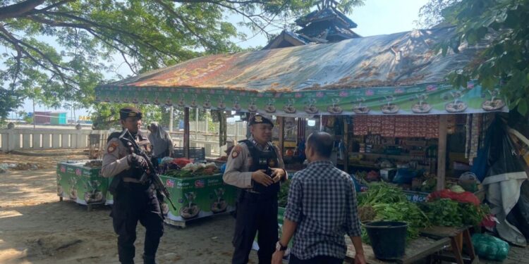 LHOKSEUMAWE – Tim Unit Reaksi Cepat (URC) Sat Samapta Polres Lhokseumawe menyambagi pedagang sayuran di pasar Pusong, Banda Sakti, Kota Lhokseumawe saat melaksanakan patroli cegah aksi premanisme, Senin (20/3/2023) pagi.