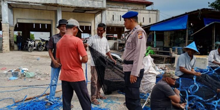 LHOKSEUMAWE – Patroli di PPI Pusong, Kecamatan Banda Sakti, Kota Lhokseumawe, personel Satpolairud Polres Lhokseumawe memantau aktivitas nelayan, Jumat (26/5/2023).