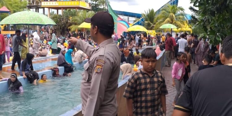 LHOKSEUMAWE – Patroli di obyek wisata Water Boom Mangat Ceria, Kecamatan Blang Mangat, Kota Lhokseumawe, personel Polsek Blang Mangat memberikan himbauan kepada pengunjung, Minggu (2/7/2023).