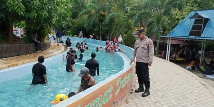 LHOKSEUMAWE – Patroli di obyek wisata Water Boom Mangat Ceria, Kecamatan Blang Mangat, Kota Lhokseumawe, personel Polsek Blang Mangat meminta wisatawan agar mengawasi anak – anaknya, Minggu (8/7/2023).