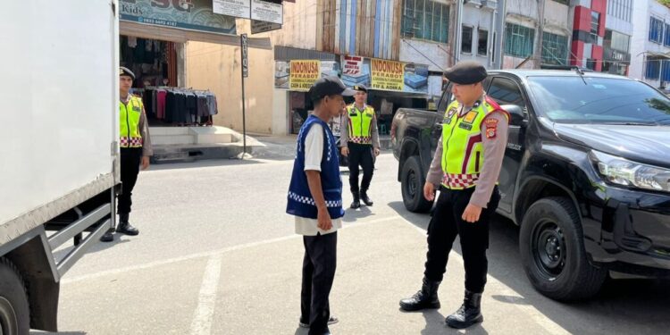 LHOKSEUMAWE – Personel Sat Samapta Polres Lhokseumawe menyambagi petugas parkir saat melaksanakan patroli kota presisi di wilayah hukum Polres Lhokseumawe, Senin (8/1/2024).