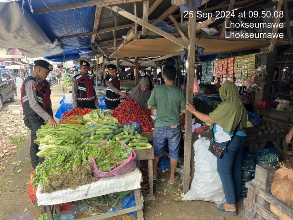 LHOKSEUMAWR – Satuan Samapta Polres Lhokseumawe melaksanakan kegiatan Patroli Kota Presisi di pusat perekonomian dan pasar pada Rabu (25/9/2024). Kegiatan ini bertujuan untuk menjaga situasi pasar tetap kondusif, serta memberikan rasa aman dan nyaman bagi pedagang dan masyarakat yang berbelanja.