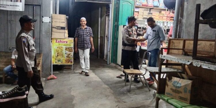 LHOKSEUMAWE – Personel Polsek Samudera menyambagi masyarakat saat melaksanakan patroli malam hari di Keude Geudong, Kecamatan Samudera, Aceh Utara, wilayah hukum Polres Lhokseumawe, Kamis (18/5/2023) malam.