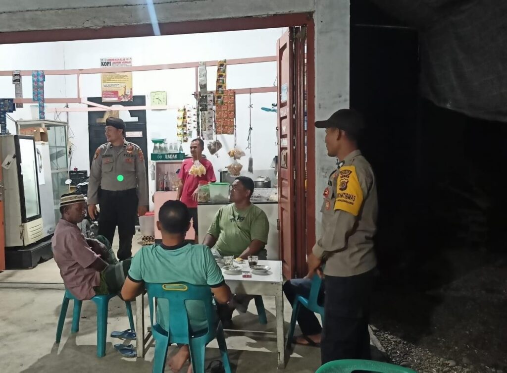 LHOKSEUMAWE – Personel Polsek Sawang melakukan patroli rutin malam hari ke gampong – gampong di wilayah tersebut, dalam kegiatan ini personel mendatangi warga di warung kopi (warkop), Rabu (31/5/2023) malam.