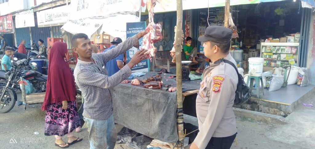 LHOKSEUMAWE – Patroli di pasar pada hari meugang, personel Polsek Syamtalira Bayu, Polres Lhokseumawe mengimbau masyarakat agar tetap menjaga Kamtibmas, Kamis (22/3/2023).