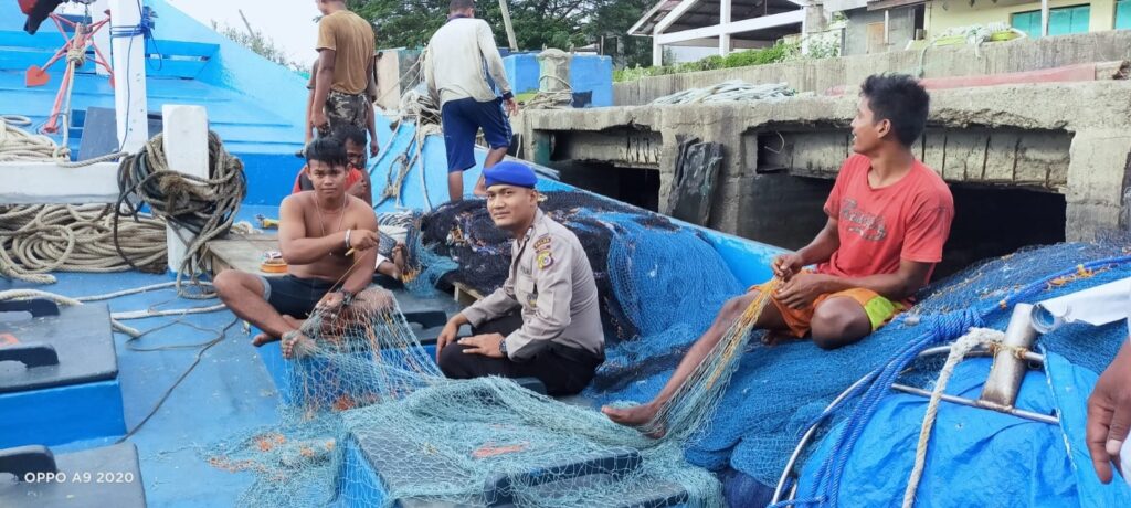 LHOKSEUMAWE – Personel Satpolairud Polres Lhokseumawe menyambagi nelayan saat melaksanakan patroli rutin di PPI Pusong, Kecamatan Banda Sakti, Kota Lhokseumawe, Minggu (14/5/2023).