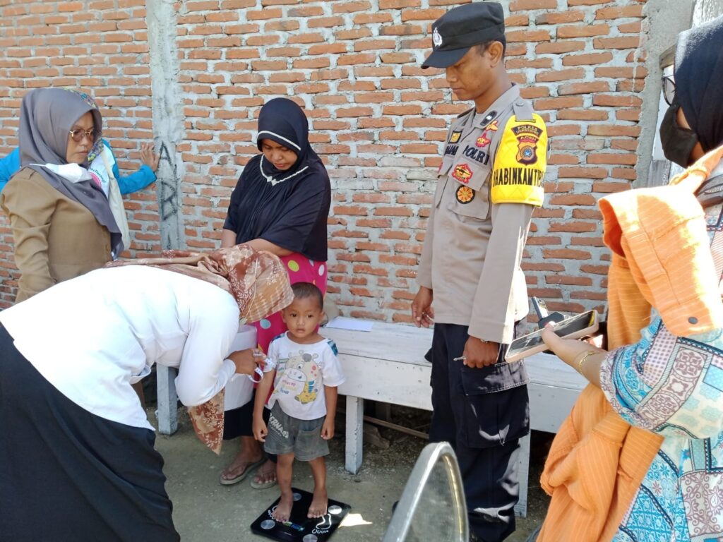 LHOKSEUMAWE – Peduli stunting, Bhabinkamtibmas Polsek Banda Sakti dampingi petugas kesehaan lakukan pengecekan dan survei terhadap balita di Desa Tumpok Teungoh, Kecamatan Banda Sakti, Kota Lhokseumawe, Selasa (30/5/2023).