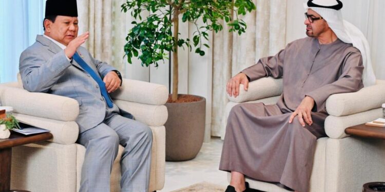 jakarta – Presiden Republik Indonesia (RI) Prabowo Subianto dan Presiden Persatuan Emirat Arab (PEA) Mohamed bin Zayed Al Nahyan (MBZ) mendengarkan secara langsung pengumuman delapan memorandum of understanding (MoU) dan letter of intent (LoI) yang telah disepakati dan ditandatangani oleh kedua negara. Pengumuman tersebut dilakulan di akhir pertemuan bilateral kedua pemimpin negara yang digelar di Istana Qasr Al Shatie, Abu Dhabi, Rabu (09/04/2025).