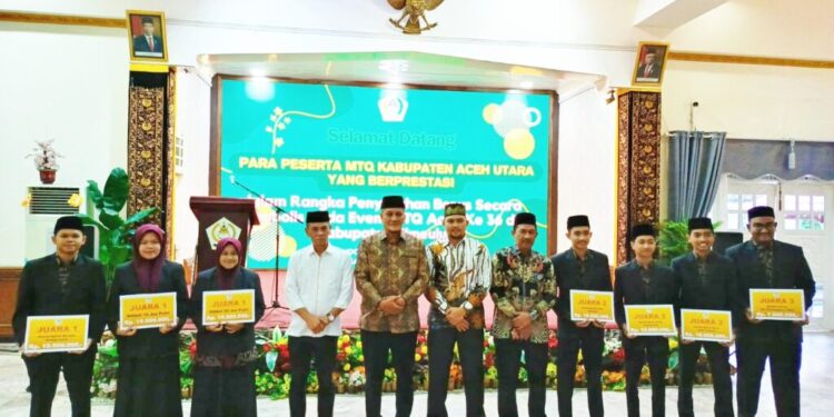 LHOKSUKON – Penjabat (Pj) Bupati Aceh Utara Dr. Drs. Mahyuzar, MSi melalui Pj Sekda, Dayan Albar, S.sos, MAP menyerahkan bonus kepada para peserta berprestasi Musabaqah Tilawatil Qur’an (MTQ) Aceh ke XXXVI Tahun 2023 tingkat provinsi di Simeulue. Pemberian bonus tersebut dilaksanakan di pendopo bupati Aceh Utara di Lhokseumawe, Sabtu (2/3/2024).