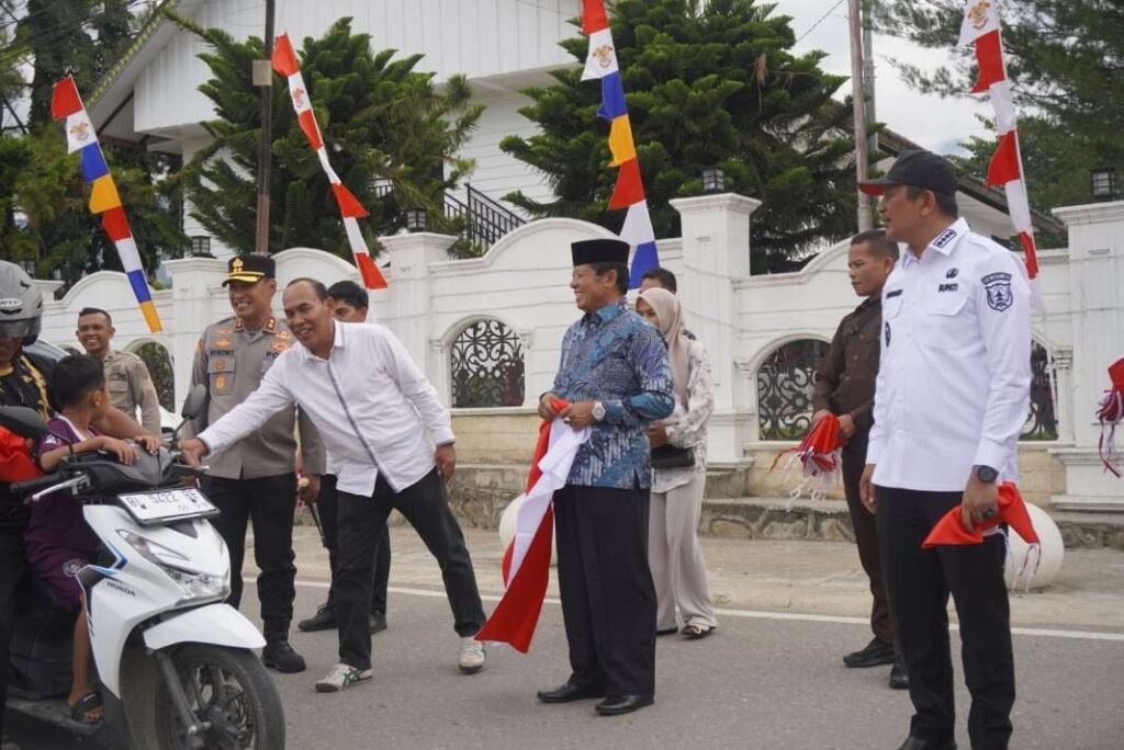 Blangkejeren – Menjelang HUT RI ke 80 tahun yang akan jatuh pada 17 Agustus mendatang, Bupati Gayo Lues beserta unsur Forkopimda bagikan bendera merah putih kepada pengendara yang melewati jalan raya depan Pendopo Bupati Gayo Lues, Rabu (13/8/2025).