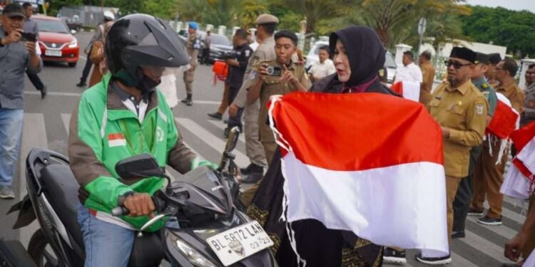 Banda Aceh – Wali Kota Banda Aceh, Illiza Sa’aduddin Djamal mengajak warga kota untuk mengibarkan bendera merah putih di rumah masing-masing. Imbauan tersebut disampaikan saat membagikan 500 bendera, di kawasan Masjid Raya Baiturrahman, Kota Banda Aceh pada Senin (11/8/2025).