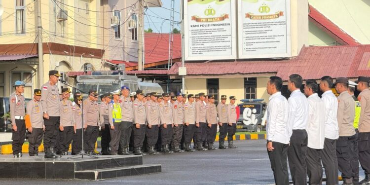 Lhokseumawe — Kapolres Lhokseumawe AKBP Dr. Ahzan, S.I.K., M.S.M., M.H., memberikan arahan sekaligus motivasi kepada seluruh personel saat memimpin apel pagi di halaman Mapolres Lhokseumawe, Senin (29/12/2025).