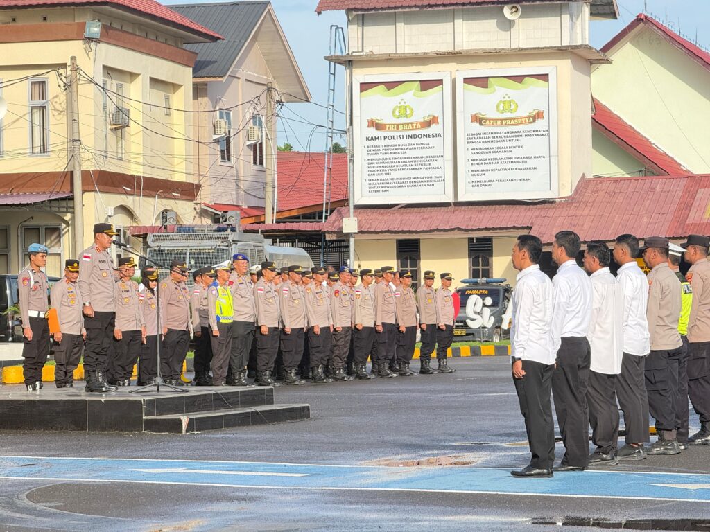 Lhokseumawe — Kapolres Lhokseumawe AKBP Dr. Ahzan, S.I.K., M.S.M., M.H., memberikan arahan sekaligus motivasi kepada seluruh personel saat memimpin apel pagi di halaman Mapolres Lhokseumawe, Senin (29/12/2025).