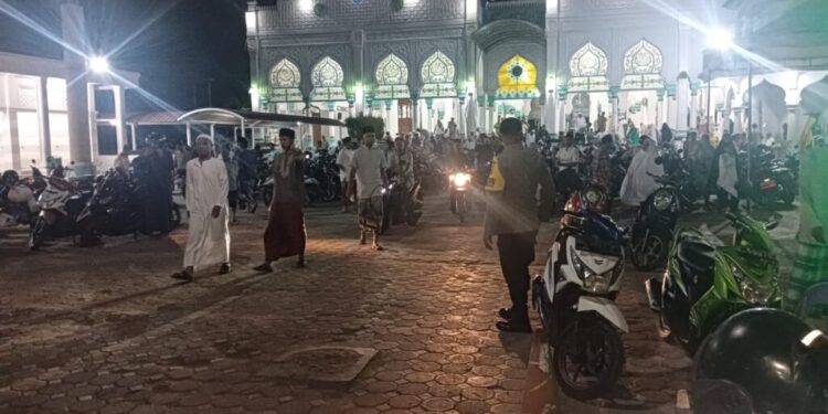 LHOKSEUMAWE – Pengamanan ibadah shalat Isya dan tarawih di Masjid Al Ikhlas Batuphat, Kecamatan Muara Satu, Kota Lhokseumawe, personel Polsek Muara Satu atur lalu lintas cegah kemacetan, Selasa (18/4/2023) malam.