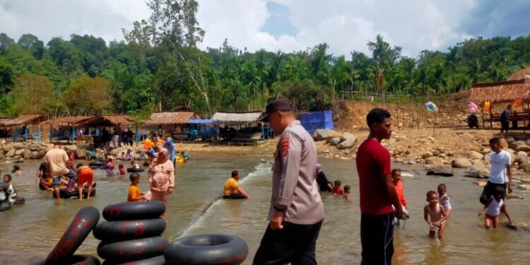 LHOKSEUMAWE – Personel Polsek Kuta Makmur melakukan patroli dan pengamanan di sejumlah obyek wisata di wilayah tersebut, dalam kegiatan ini personel menyambagi wisatawan.