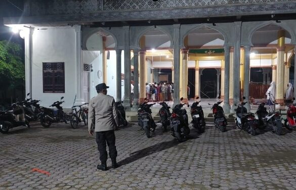 LHOKSEUMAWE – Personel Polsek Blang Mangat melaksanakan pengamanan shalat tarawih di Masjid Darul Falah, Desa Tunong, Kecamatan Blang Mangat, Kota Lhokseumawe, Minggu (9/4/2023) malam, dalam kegiatan ini personel menjaga kendaraan bermotor milik jemaah.