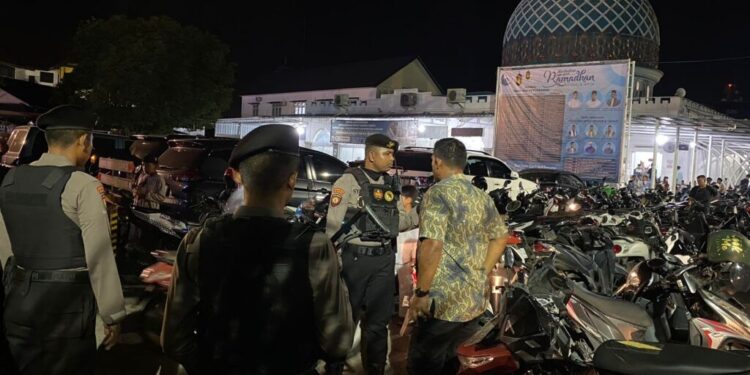 LHOKSEUMAWE – Tim Unit Reaksi Cepat (URC) Sat Samapta Polres Lhokseumawe melaksanakan pengamanan shalat tarawih di Masjid Jamik dan Masjid Al Atqa Kota Lhokseumawe, dalam kegiatan ini personel memberi himbauan kepada remaja, Rabu (29/3/2023) malam.