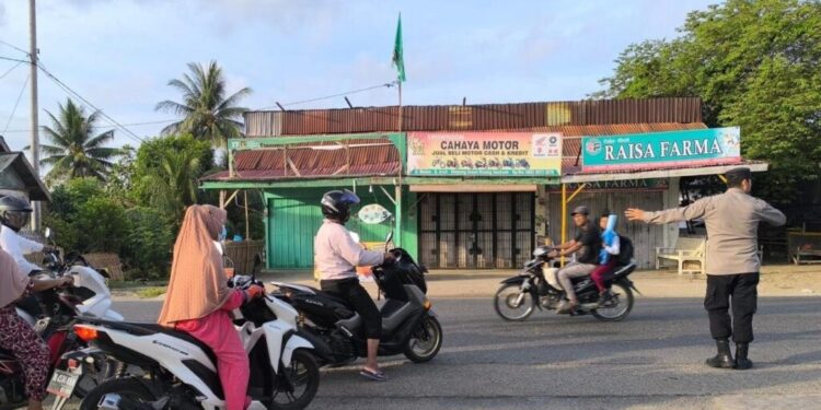 ACEH UTARA, Dalam upaya mengurangi kemacetan pada jam jam sibuk pagi hari Personel Polsek Dewantara Polres Lhokseumawe Polda Aceh melaksanakan pengaturan di seputaran keude Krueng Geukueh di Kecamatan Dewantara (05/9/2024).pagi.