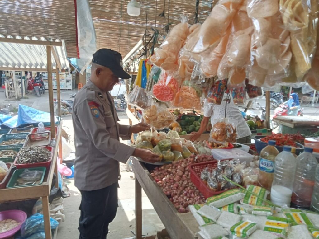 LHOKSEUMAWE – Personel Polsek Simpang Keuramat mendatangi pedagang di pasar tradisional di Keude Simpang Empat, Simpang Keuramat, Aceh Utara, wilayah hukum Polres Lhokseumawe, kegiatan tersebut guna mengecek sembako, Selasa (23/5/2023).