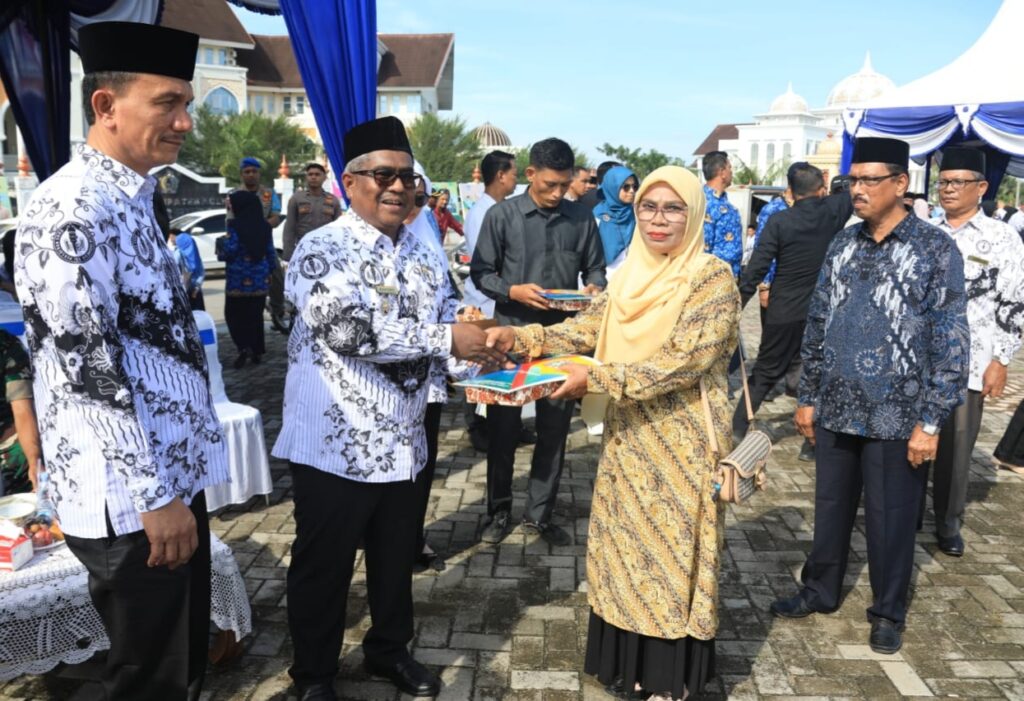 Aceh Utara — Pemberian penghargaan untuk puluhan guru dan kepala sekolah berprestasi mewarnai kegiatan memperingati Hari Guru Nasional (HGN) ke-79 jajaran Pemerintah Kabupaten Aceh Utara, Senin, 25 November 2024.