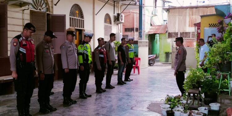 LHOKSEUMAWE – Perayaan Hari Kenaikan Isa Almasih, personel gabungan Polres Lhokseumawe melakukan pengamanan di gereja di wilayah Kota Lhokseumawe, Kamis (18/5/2023).