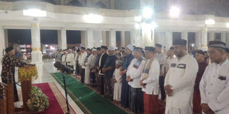 LHOKSEUMAWE – Ratusan masyarakat larut dalam doa  pada peringatan tahun baru Islam 1 Muharram 1445 di Kota Lhokseumawe di Masjid Islamic Center, Selasa (18/7/2023) malam, kegiatan ini turut dihadiri unsur Muspida dan ratusan masyarakat.